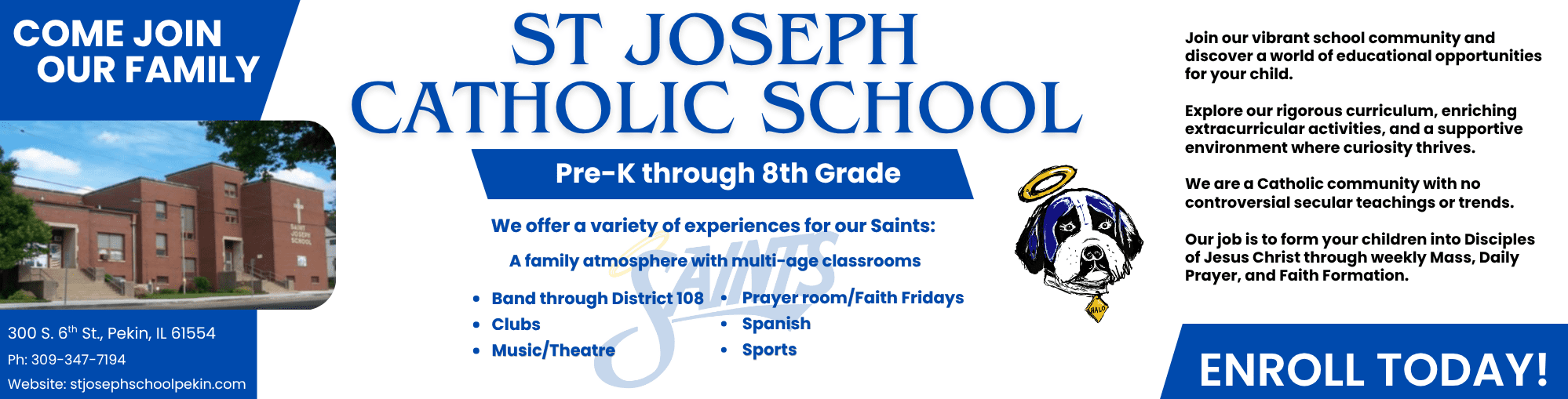 St. Joseph Catholic School is a community of faith whose mission to educate the whole child is based upon the Gospel Values and the teachings of the Catholic Church. Catholic and Non-Catholic families are welcome. The School provides a full array of academic resources and extracurricular programs, as well as extended care. Keeping with Catholic tradition, our outstanding faculty, staff and parent community, create within St. Joe's, warm and accepting environment. Student success is a reflection of our commitment to a school culture that is child-centered and student-focused.