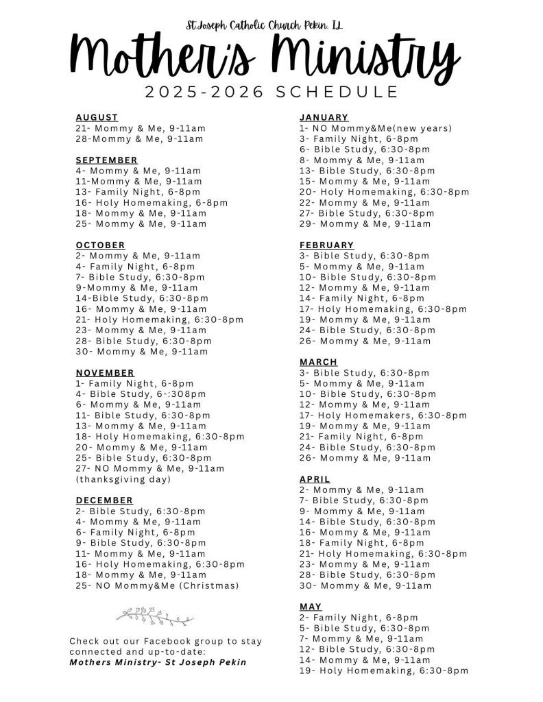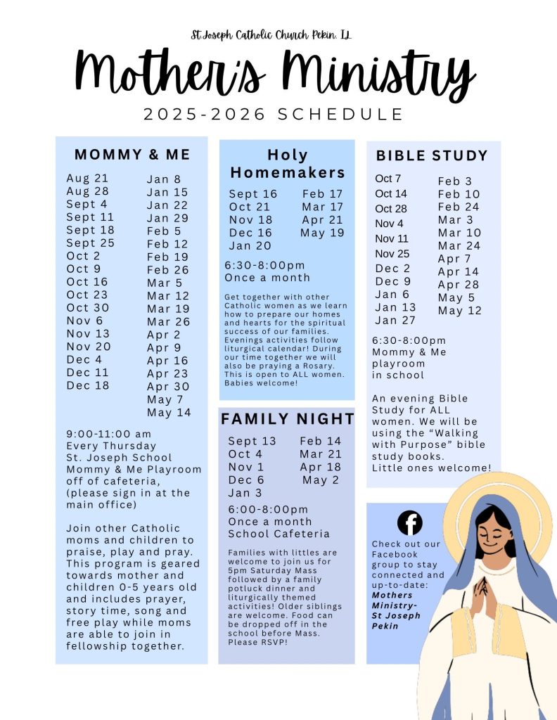 Welcome! We are a Ministry at St. Joseph Catholic Church in Pekin IL. We have Women Bible Studies, Family Nights, Mommy & Me Playdates, Holy Homemakers Nights and so many more opportunities to praise Jesus and learn to imitate His Blessed Mother with other like-minded, faith-filled women!